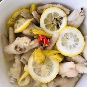 凤爪和姜、葱、花椒、八角、料酒一起冷水下锅,煮开后转小火慢煮15分钟左右就可以捞出来,用冷开水冲洗干净去油