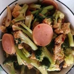 蔬菜洗净切好,香菇,西兰花,有机花焯水备用,炸豆腐火腿肠切好。