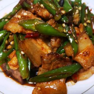 锅内下油,煸炒五花肉片,加入一勺豆瓣酱翻炒