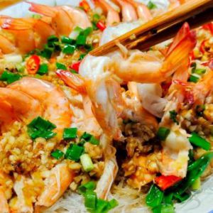 将调好的蒜蓉酱铺在虾和粉丝上,然后开水上锅蒸5~7分钟即可出锅,最后撒上葱花,小米椒圈点缀增色,再淋入生抽酱油,泼上热油激发出葱花的香味,这样一份制作精致,虾肉鲜嫩,粉丝入味好吃的蒜蓉粉丝蒸虾就做好了。