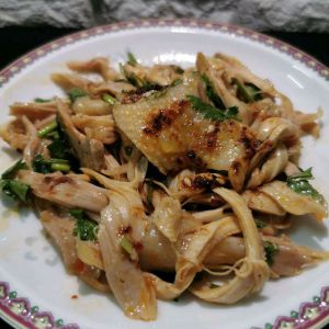 一小撮葱花、香菜末,加上所有的调味一起跟鸡丝拌匀,就完成了。