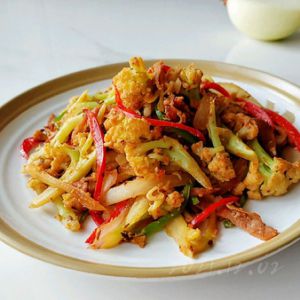 努力把料倒腾匀撒上提前准备好的青红椒条或者大葱香菜段,端锅离火揪朵花尝尝小心烫