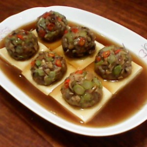 然后将所有剁好的材料放在一个干净的盘子里,加入少许盐,味精和适量的胡椒粉,拌匀;接着将准备好的肉馅做成丸子状,放在摆好的豆腐上