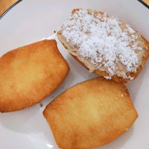 炸好的馒头片先抹上一层麻酱,再撒上一层绵白糖。开吃!