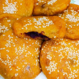 锅里倒油,开小火把南瓜饼放进去反复煎至两面金黄,就可以出锅了。