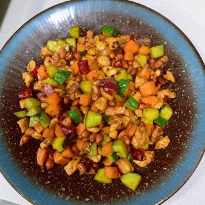 鸡胸肉切丁,加入适量料酒、盐、白胡椒粉和淀粉抓匀腌制10分钟以上。