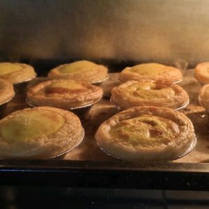 烤制的时候蛋挞会涨的比较高,大家到后面要注意观察蛋挞表皮颜色不要烤过。