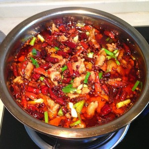 洗锅,放花生油和辣椒油的混合油,四成热时放剪好的干辣椒、花椒、藤椒,炒片刻,连油快速倒入菜品中。听到辣椒、花椒在肉片上滋滋作响,一道爽口的水煮肉片就大功告成啦!
