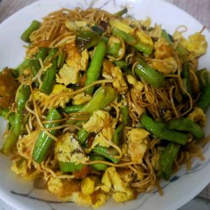 豆角炒至7成熟后把面条放进去进行搅拌,一定要赶紧把面条搅拌均匀,让每根面条上都沾满菜汁。搅拌均匀后加入盐,鸡精。最后放入刚刚煎好的鸡蛋。