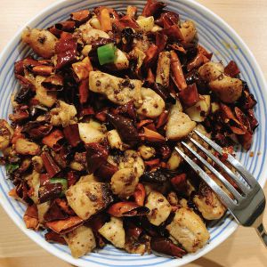 Ⅲ 换油,放入干辣椒,花椒。再放入酥脆鸡肉丁油炸,加盐盛出。