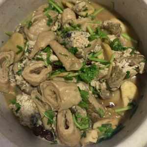 清洗干净(需要面粉、醋和酒清洗,然后焯水,不是自己洗的不多说)的大肠头,切成小段备用
