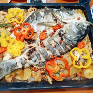 菜平铺到烤盘,墙面摆上煎好的鱼,最好在淋上炒过的辣椒酱,这样有滋味。