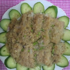 黄瓜洗净切片,加入盐,糖,醋,蚝油,香油拌匀围在肉的四周