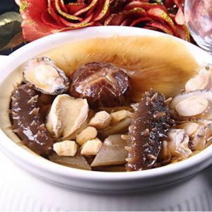 分5角分别放:猪蹄筋、虾仁、海参、花菇、鲍鱼