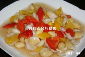 起锅热油,下姜片爆香后,下柿子椒稍微翻炒一下,加入鲜百合、银杏果翻炒;