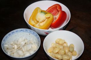 红黄柿子椒洗净切菱形片、鲜百合去除老鳞后一片片剥下来洗净、银杏果洗净,用加了盐的开水烫熟;