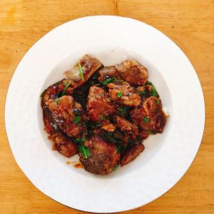 油锅里加入白糖炒出焦糖色,然后倒入排骨,加入酱油、醋翻炒均匀,撒入葱花点缀。起锅,开吃!