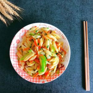 将胡萝卜,辣椒切成丝,香肠切成丁
