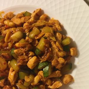待鸡胸肉丁完全上颜色后,放入黄瓜丁和熟花生。