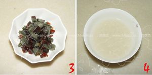 1.牛肉切小丁,放入香油、盐、淀粉搅拌均匀;小葱切粒,皮蛋切粒