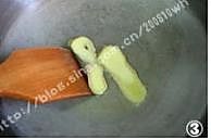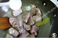 肉质变色略为收缩时,加小勺白糖翻炒均匀,再加入1勺精盐翻炒,锅内喷少许料酒掂匀锅;
