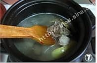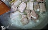 将排骨及汤水倒入汤煲内,一次性加足清水,大火煮开后,将浮沫撇掉,转小火加盖煨煮;