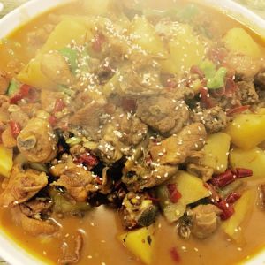 把青椒和葱段炒至断生,加入土豆,还有炖的鸡块,汤要多一点。因为,要拌面