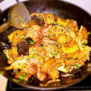 依次倒入菜(注意先倒入不太容易熟的)翻炒一下 倒入海底捞麻辣香锅底料,翻炒均匀,直至菜熟即可
