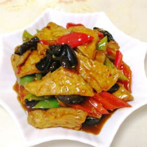 水开放炸好的豆腐,木耳,青红椒,炒匀。根据颜色放生抽,老抽或者红烧酱油调色,调半小碗水淀粉勾芡,淋点明油出锅装盘。