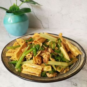 10.腐竹有点变软的时候加入青椒碎翻炒。