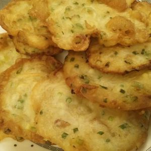油热后小火,每次用大勺舀一勺直接倒入锅中慢慢炸,油饼一会后会自然浮起,用筷子翻面炸,注意颜色金黄后出锅