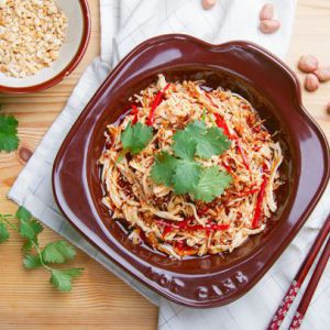 鸡丝跟红椒丝混合,淋上调好的料汁,再撒一些花生碎。