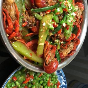 料炒好之后下龙虾,下料酒,翻炒均匀,放盐,口味自己把控,加啤酒或者开水,平至小龙虾,大火煮