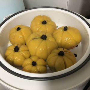 用牙签将面团压出南瓜纹路,顶部放一颗黑加仑。放入蒸锅,我用的是电饭煲,空间比较小。南瓜底部我垫了胡萝卜片,否则很容易黏在笼屉上。