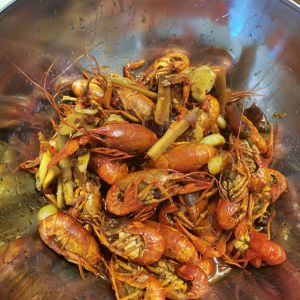 锅里起油,多倒点油,油热后倒入控好水后的小龙虾,划拉15秒出锅。