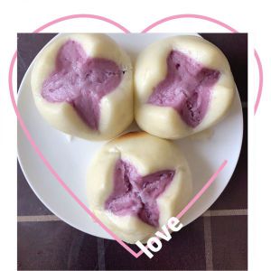 发酵好后揉搓排气,分成等份,白面擀成皮,紫薯面团揉成球