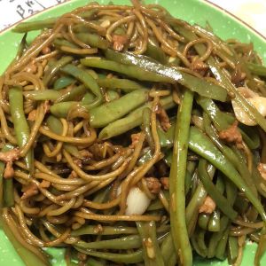 4、水干打开锅盖,把面和扁豆拌匀,可再加适量酱油和盐,放少许蒜末即可出锅。