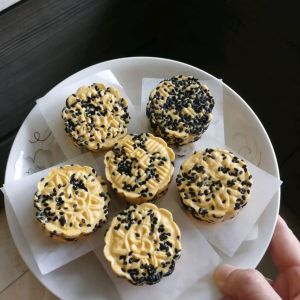 取其中一个剂子,搓成杯子壮,装入豆沙,搓圆