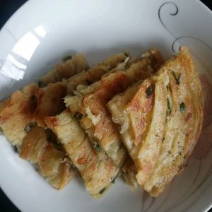 面团擀薄,表面刷油,撒上盐、花椒粉和多多的葱花。