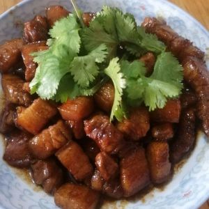2.把买回来的五花肉和香菜洗净后,备用。把五花肉切成1.5平方厘米的小块,焯水后放锅里煎炒出油。