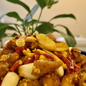 锅中放少许油,加入泡好的辣椒,蒜,姜片,小火慢炒,炒至水分变干,闻到香味。放入鸡块,花生米。大火翻炒~由于鸡块已经腌制过,再次炒就不需要放调料了。