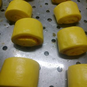 以做花卷,方式撠大皮。放入适量胡萝卜渣批薄卷起,边边抺少水,以沾住。方便沾住不松