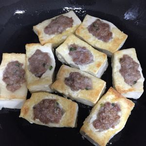 酿好后可以进锅煎了,有肉的这面朝下先煎这面,待金黄后再煎另一面,最后放入清水调味后盖盖子闷几分钟,这时候已经是带芡的状态了,最后出锅排盘,尽然忘记拍排盘的造型了