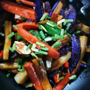 将茄子条等配料倒入,加入少许盐、鸡精、味精,翻炒半分钟至调理均匀,出锅。