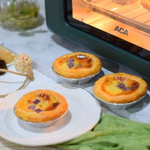 准备好所有材料后蛋挞皮摆放在烤网上,蛋挞皮我用的中号。在每个蛋挞皮中间放上几块紫薯丁