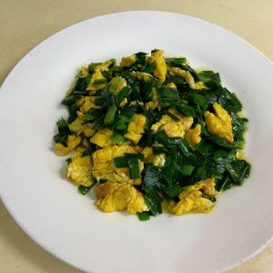 锅内放油,炒韭菜,放盐、最多不超过一分钟