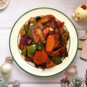 再放入尖椒、洋葱和之前煮过的胡萝卜,可以加一点点盐