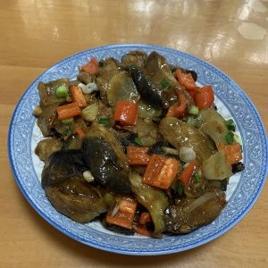 另起油锅,少量油即可(因为茄子吸了不少油),放入蒜末闻香后放入生抽、老抽、蚝油、盐、少许水,待沸腾后倒入茄子和土豆片,翻炒。