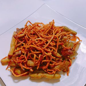 出锅前再加入蒜和香油少许,将面和扁豆彻底翻拌均匀
