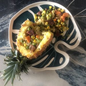 加入米饭翻炒出香味,放入凤梨继续翻炒,最后放入芝士小火焖至拉丝